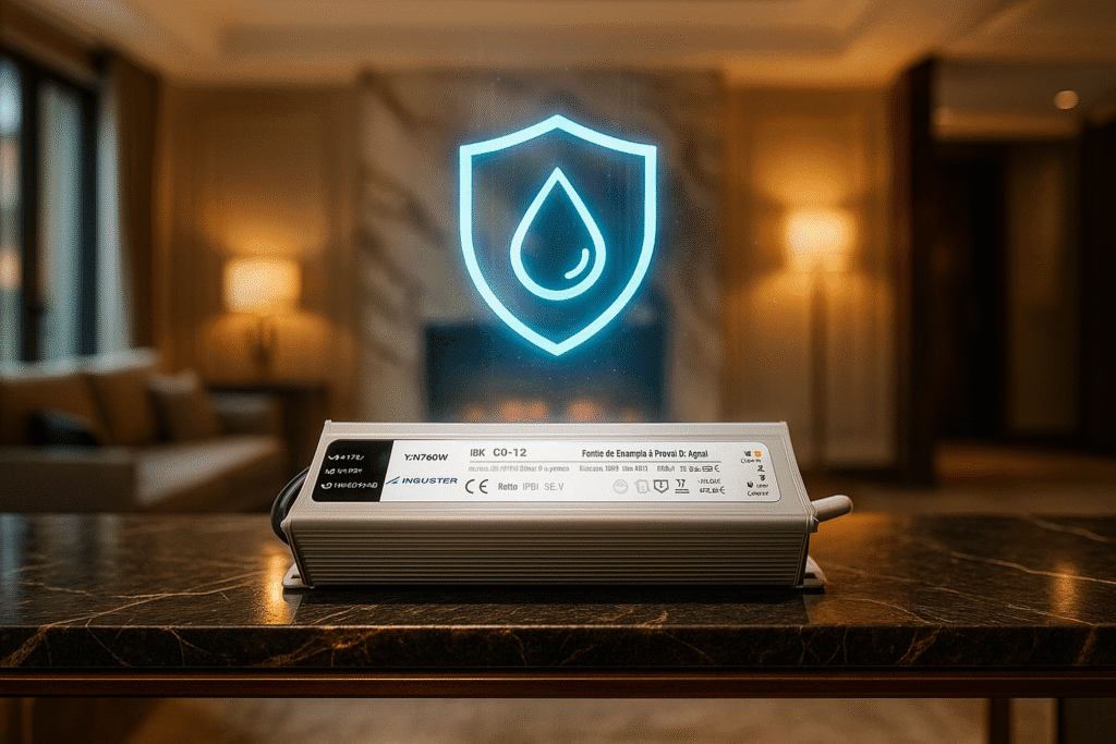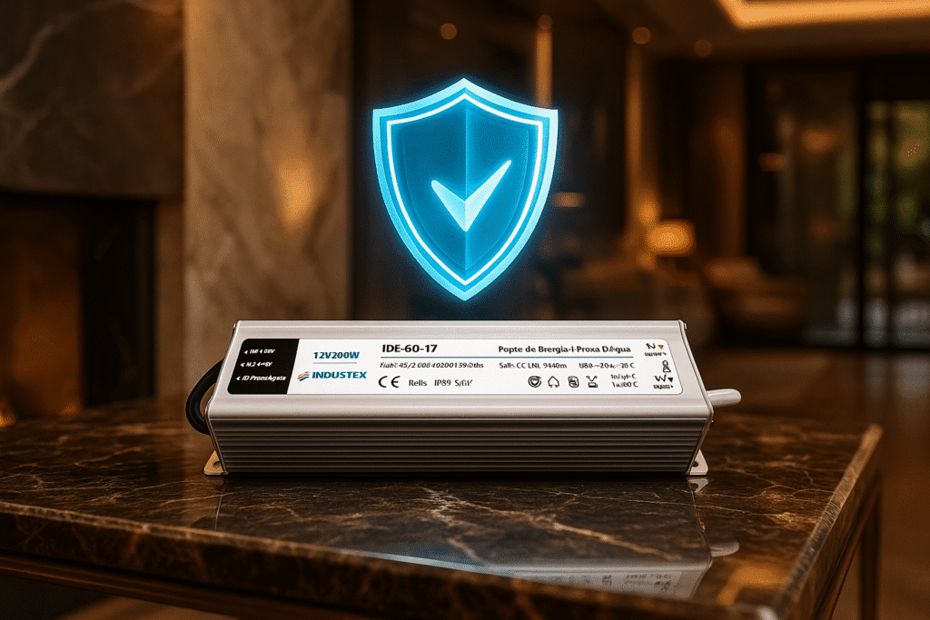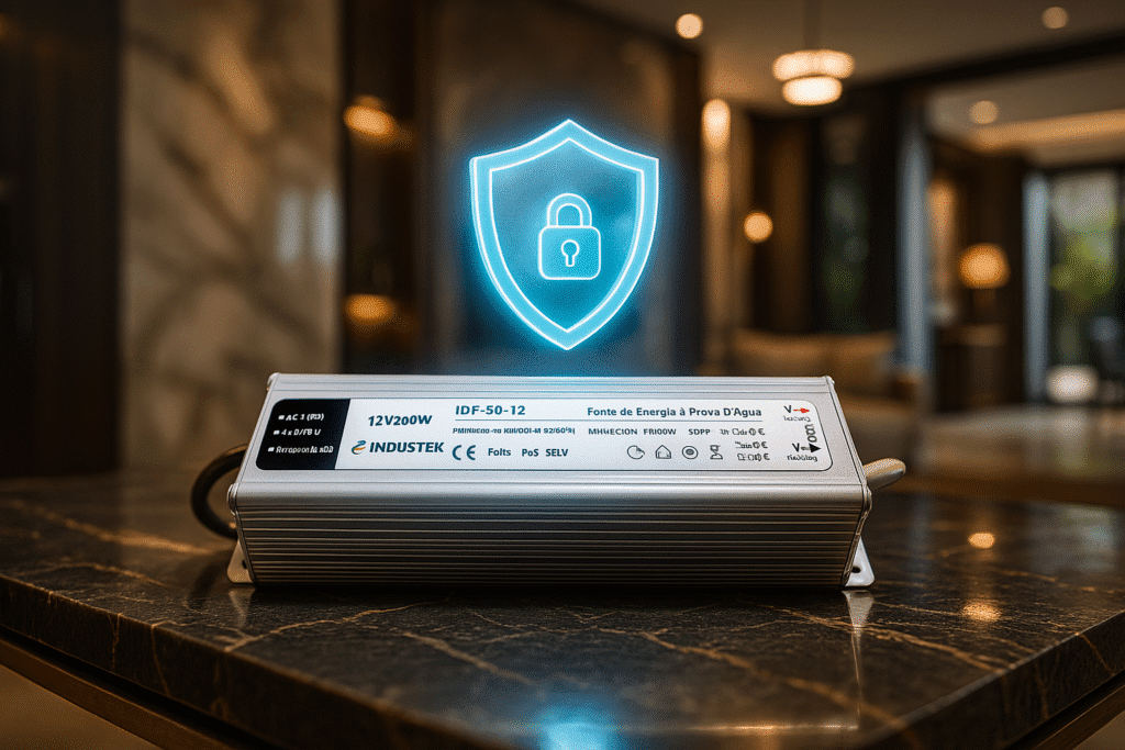 Transforma a energia da rede em 12V de baixa tensão, garantindo proteção total em áreas úmidas e eliminando riscos para usuários e equipamentos.